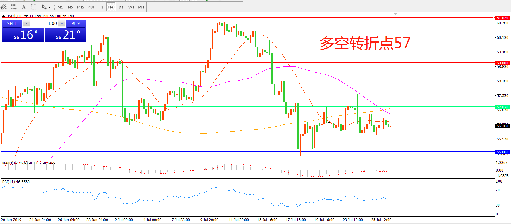 上周API原油库存和EIA原油库存大幅下降,给油价上行提供了一定支撑, 美国WTI原油周五(7月26日)收报56.16美元/桶,本周上涨0.8%。但欧元区和美国制造业PMI数据表现较差,全球央行都有降息刺动作,令市场担忧情绪依然较浓,本周市场将迎来“超级数据周”,市场焦点集中在美联储及中美贸易磋商上,务必重点关注。