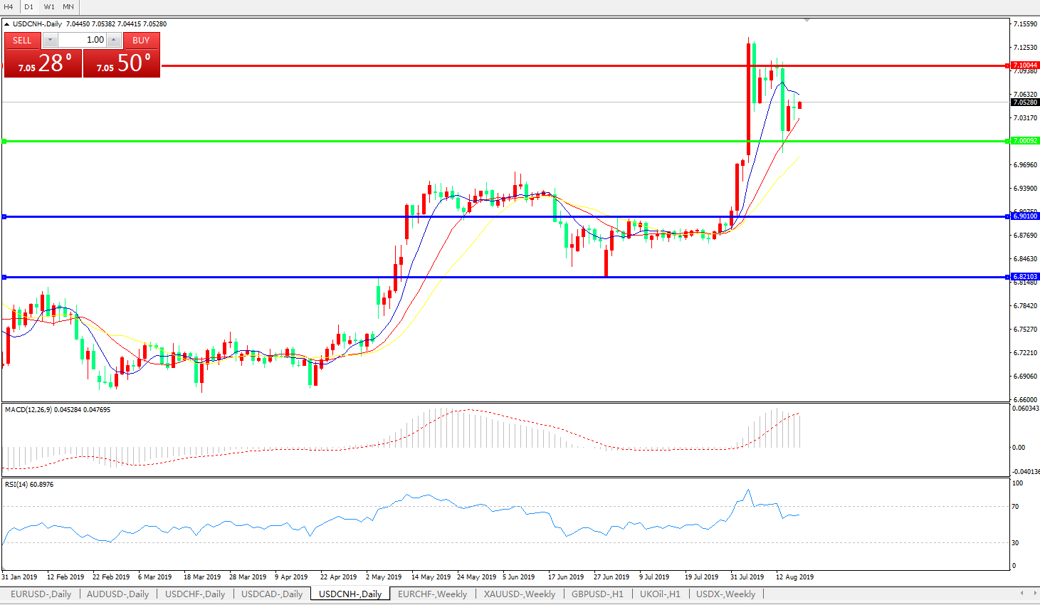 备选策略: 在7.0000之下,看跌,目标价位为6.9010,然后为6.8210。