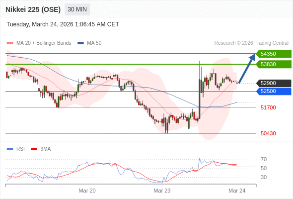 日经225股指期货 (OSE) 当日内: 在52500之上,看涨。