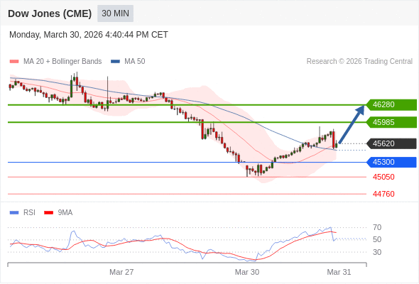 在 45300 之上,看涨,目标价位为 45985 ,然后为 46280 。