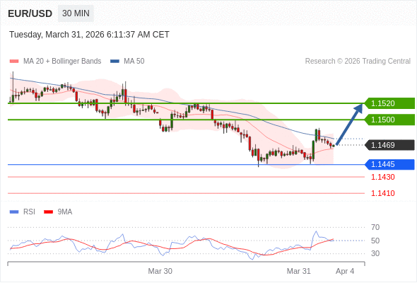 在 1.1445 之上,看涨,目标价位为 1.1500 ,然后为 1.1520 。