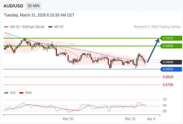 在 0.6830 之上,看涨,目标价位为 0.6890 ,然后为 0.6910 。