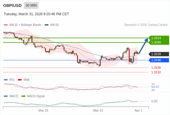 英镑/美元 当日内 : 看涨,当 1.3196 为支撑位。