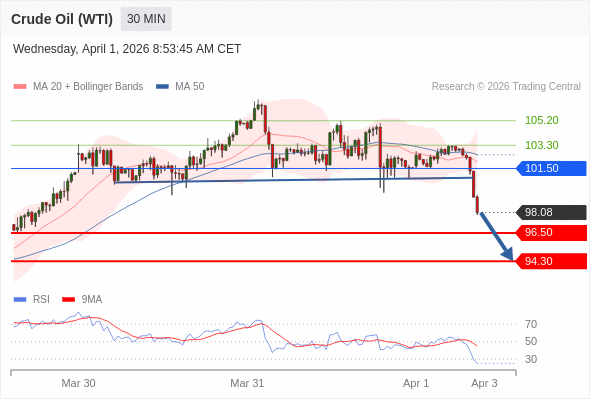 在 101.50 之下,看跌,目标价位为 96.50 ,然后为 94.30 。