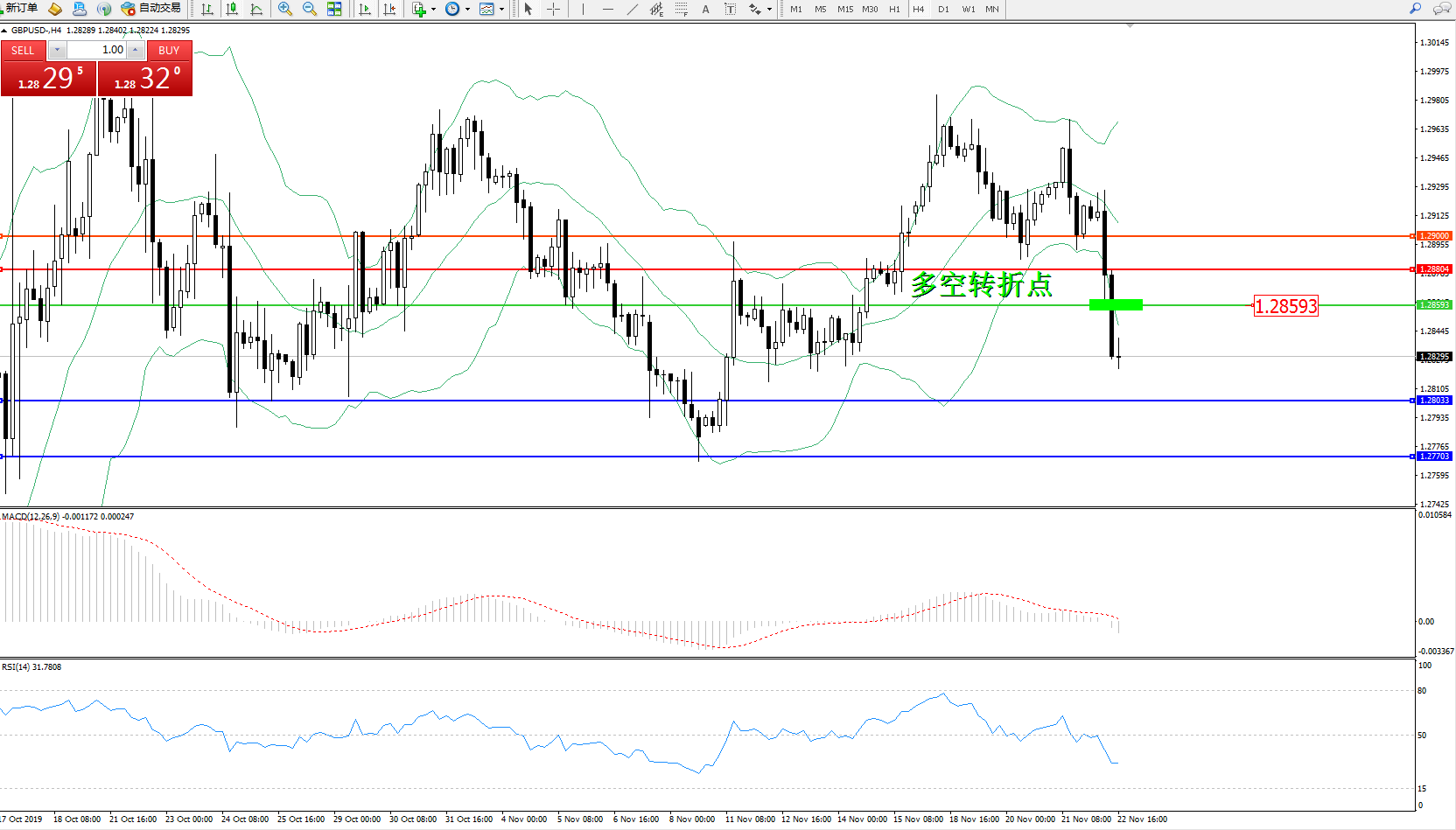 交易策略:1.28593下方看跌,目标1.28033、1.27703