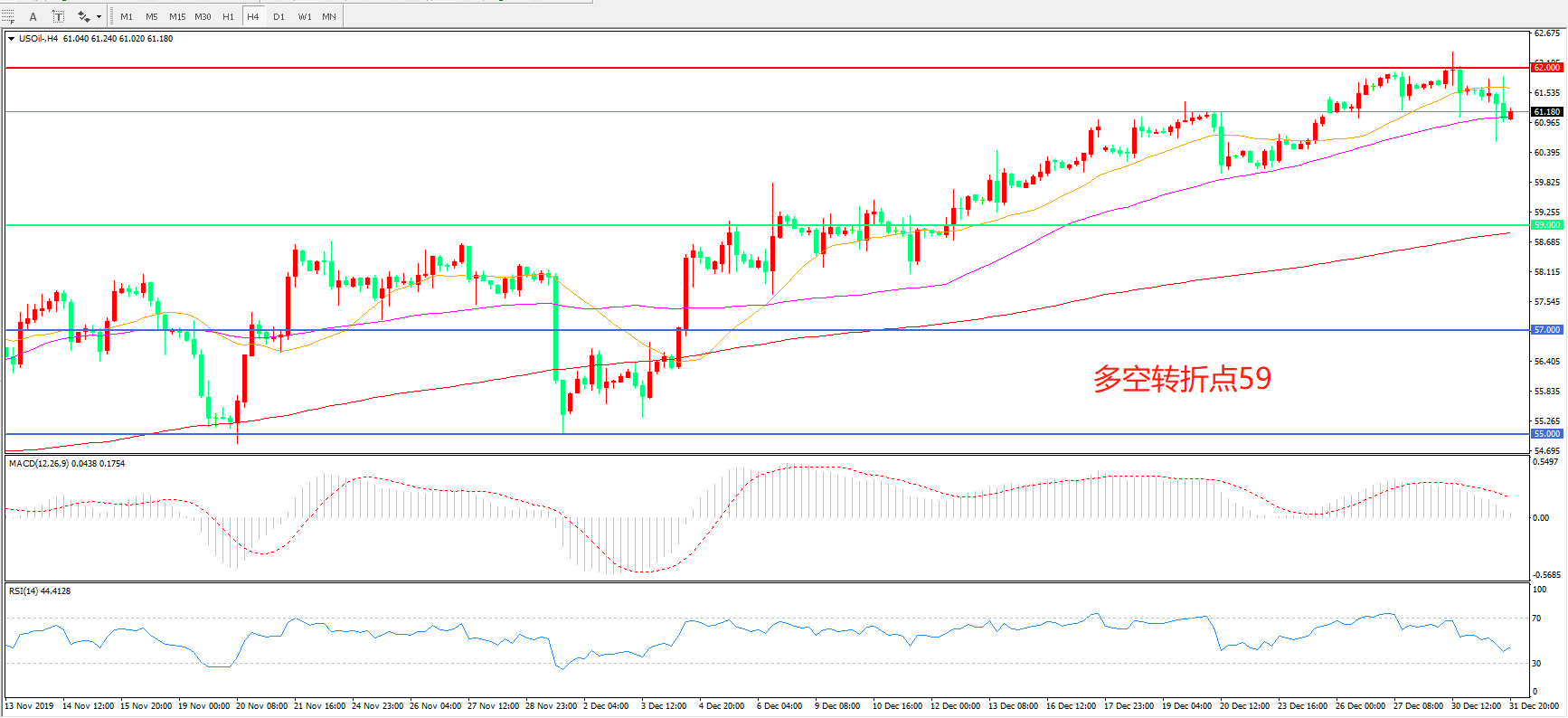 周三(1月1日)凌晨,美国石油协会(API)公布的数据显示,美国当周API原油库存减少780万桶,远超预期,纵观全年,在OPEC减产的助推下,2019年美国WTI原油大涨34.5% ,虽然近期多头锁定获利令油价适度回撤,但中美贸易乐观情绪以及更大规模的减产行动仍有望助推油价再度上行。