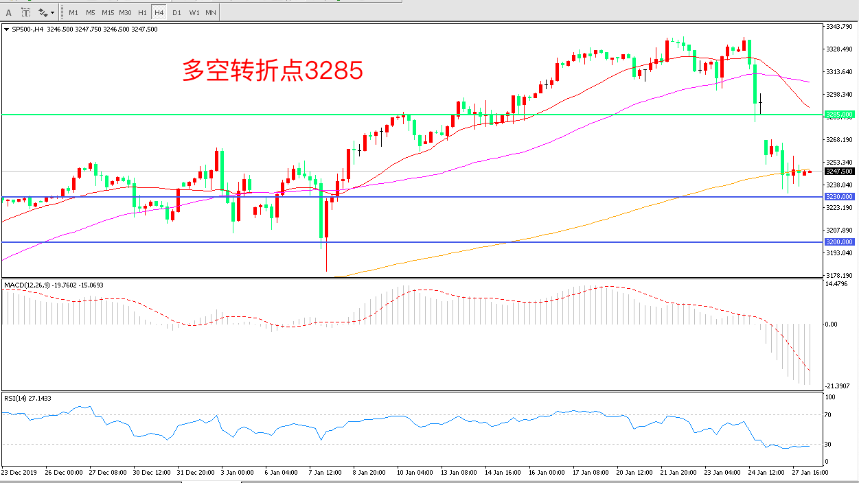 4小时图看,标普500低开低走,跌破200周期均线,整体走势十分低迷,短期均线拐头,MACD绿柱增加,RSI指标走平,日内延续下行概率较大。