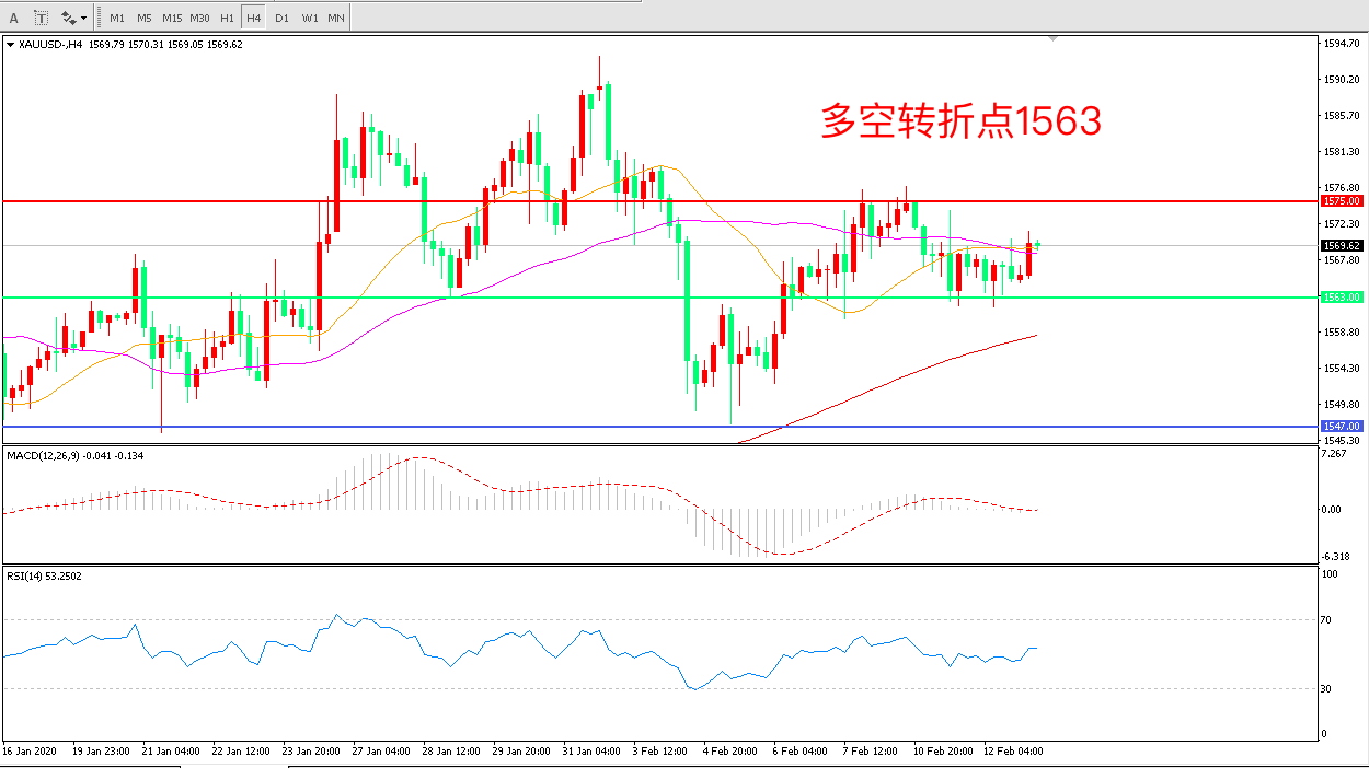 4小时图看,金价呈现区间震荡形态且振幅逐渐收窄,1563成为短期支撑均线系统走平, MACD红柱缩短RSI指标走平日内延续震荡概率较大。