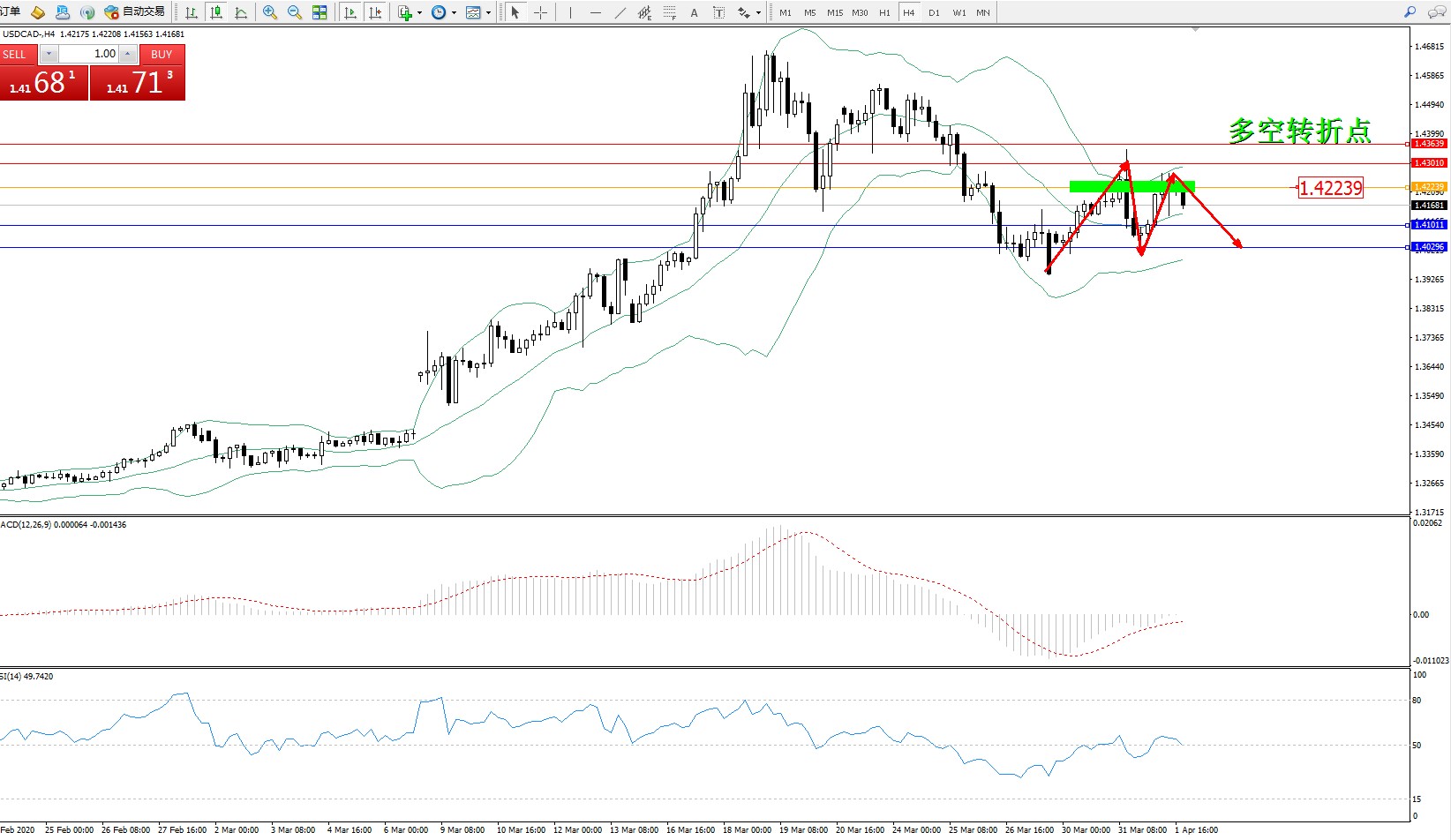 交易策略:1.42239下方看跌,目标1.41011、1.40296