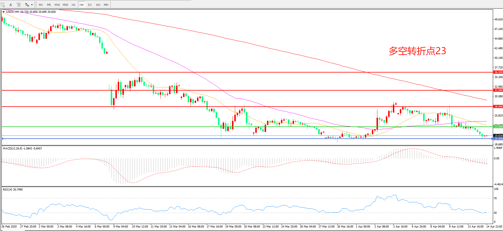4小时图看,油价震荡下行,整体表现低迷,20美元一线成为短期支撑,均线系统走平成为上方阻力, MACD绿柱增加,RSI指标走平,日内延续震荡概率较大。