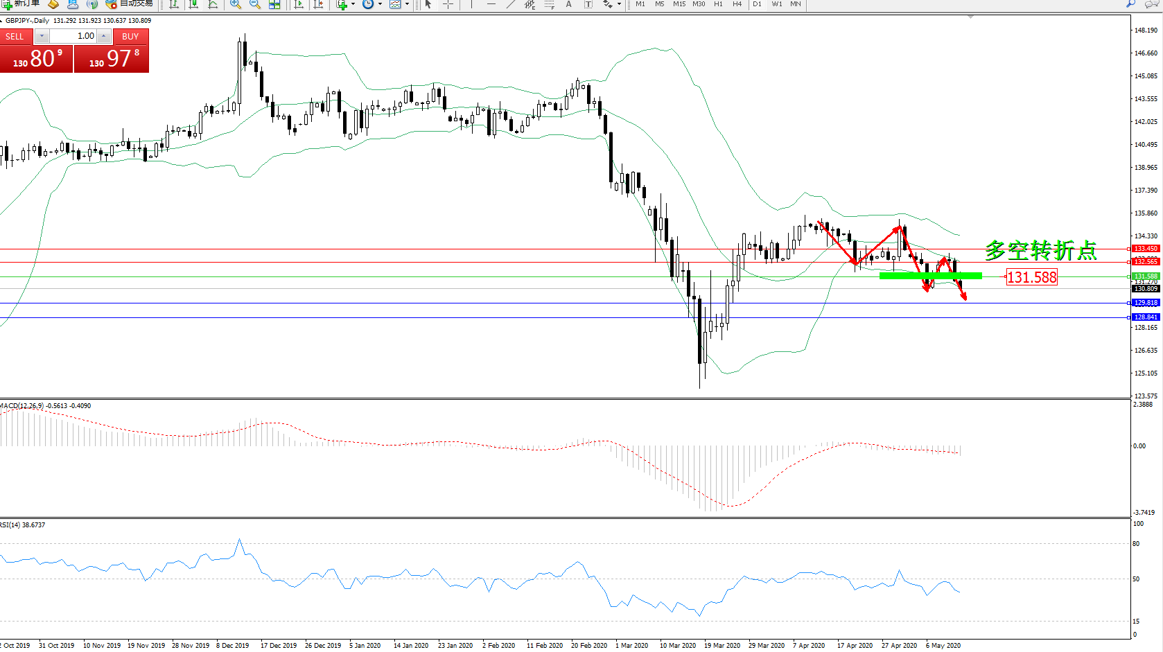 交易策略:131.588下方看跌,目标129.818128.841