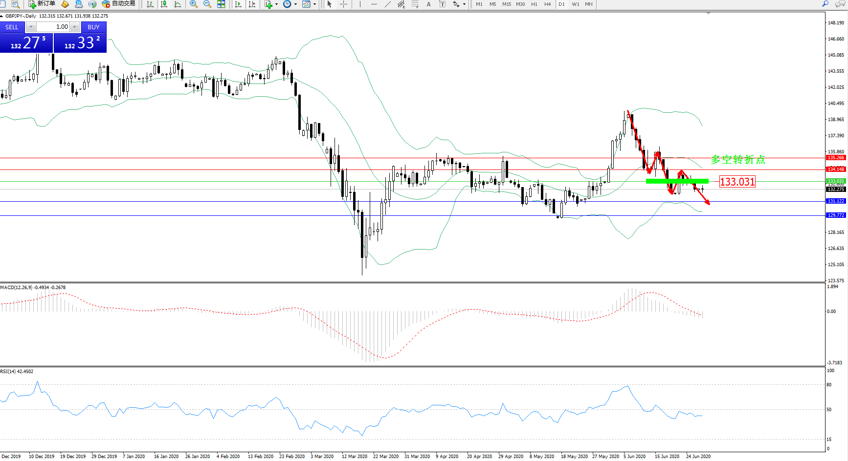 交易策略:133.031下方看跌,目标131.122129.772