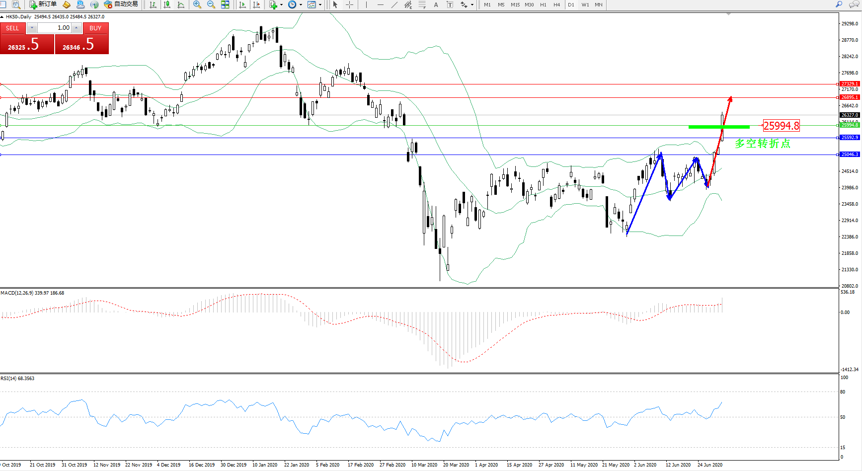 香港恒生指数76日(周一)收盘上涨966.04点,涨幅3.81%,报26339.16点;自3月收盘低点涨逾20%。港股做多情绪十分高涨,三大指数均大幅上涨。国指涨4.72%10726点。红筹指数涨6.3%4321点。念叨了几天的年线今天终于顺利突破,成交量也放出了近期的天量。南下资金大幅流入111.87亿港元,大市成交额放大至2507亿港元。中资券商股与半导体表现十分亮眼,中芯国际暴涨超20%续创新高,“回A”公布后已累涨170%,前期强势的生物医药股下跌明显,软件股亦走低。恒指今天突破了年线,其意义重大,这是属于标志性的突破。后市的走势会相对轻松。今天金融股属于全面高潮,预期差会愈来愈低,除非是消息面再度形成刺激。