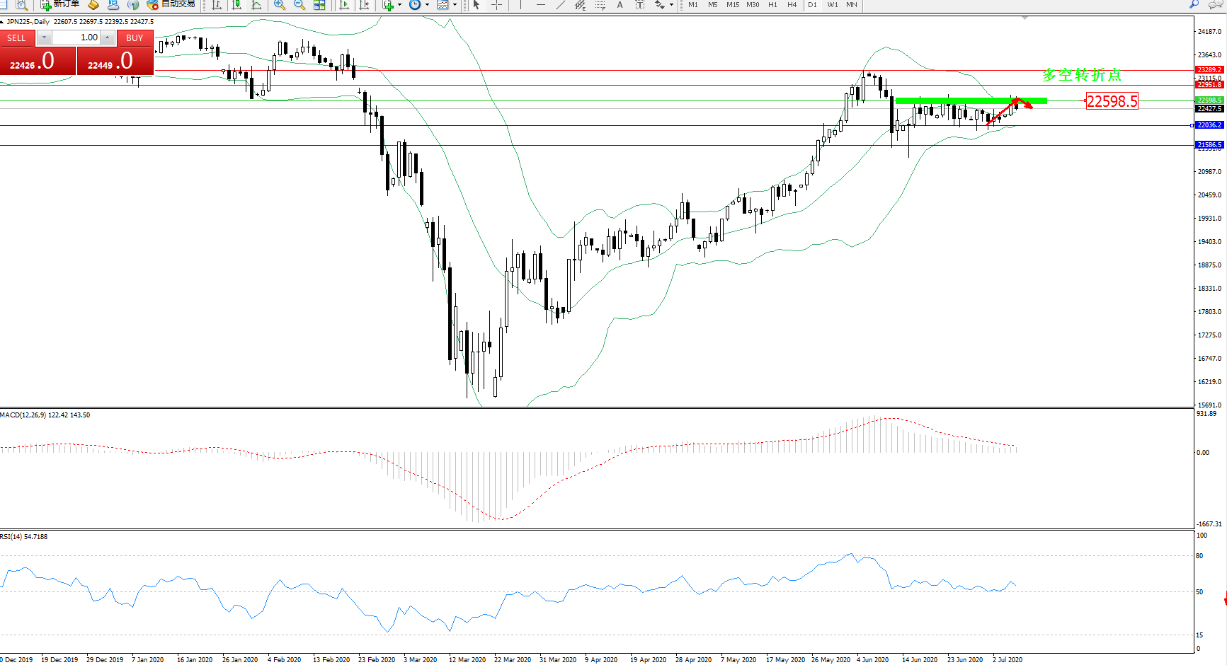 日经225指数7月7日(周二)收盘下跌140.94点,跌幅0.62%,报22573.50点。亚洲股市继续走高,尤其是中国股市继续大涨,美元指数也探底回升,而投资者似乎对愈加严峻的疫情产生了免疫,市场目前仍处于高涨的情绪中。新冠疫情席卷全球以来,日本经济在今年上半年遭受重创,各项指标全面下滑。专家认为,在日本政府出台的大规模经济刺激计划作用下,日本经济会有一定起色,但长期来看,由于多种因素影响,复苏进程可能十分缓慢。日本央行7月1日发布的今年第二季度企业短期经济观测调查结果显示,继上季度之后企业信心继续大幅恶化。其中,大型制造业企业信心指数从上季度的负8点降至负34点,为2009年二季度以来最低水平。
