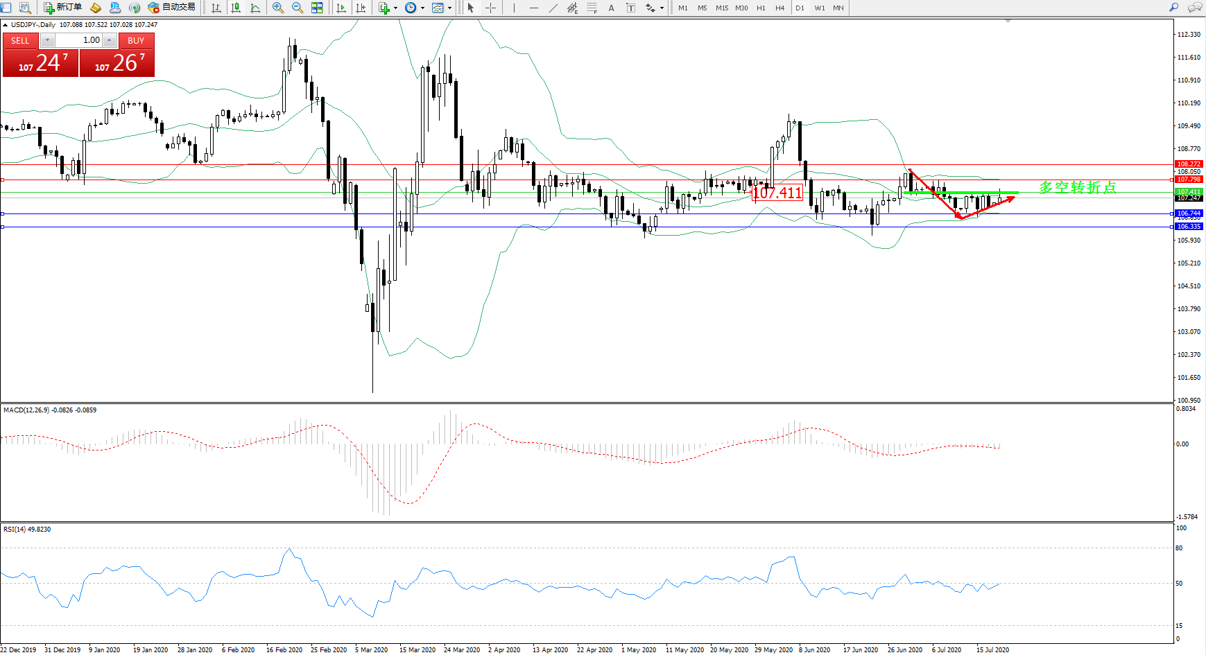 交易策略:107.411下方看跌,目标106.744、106.335