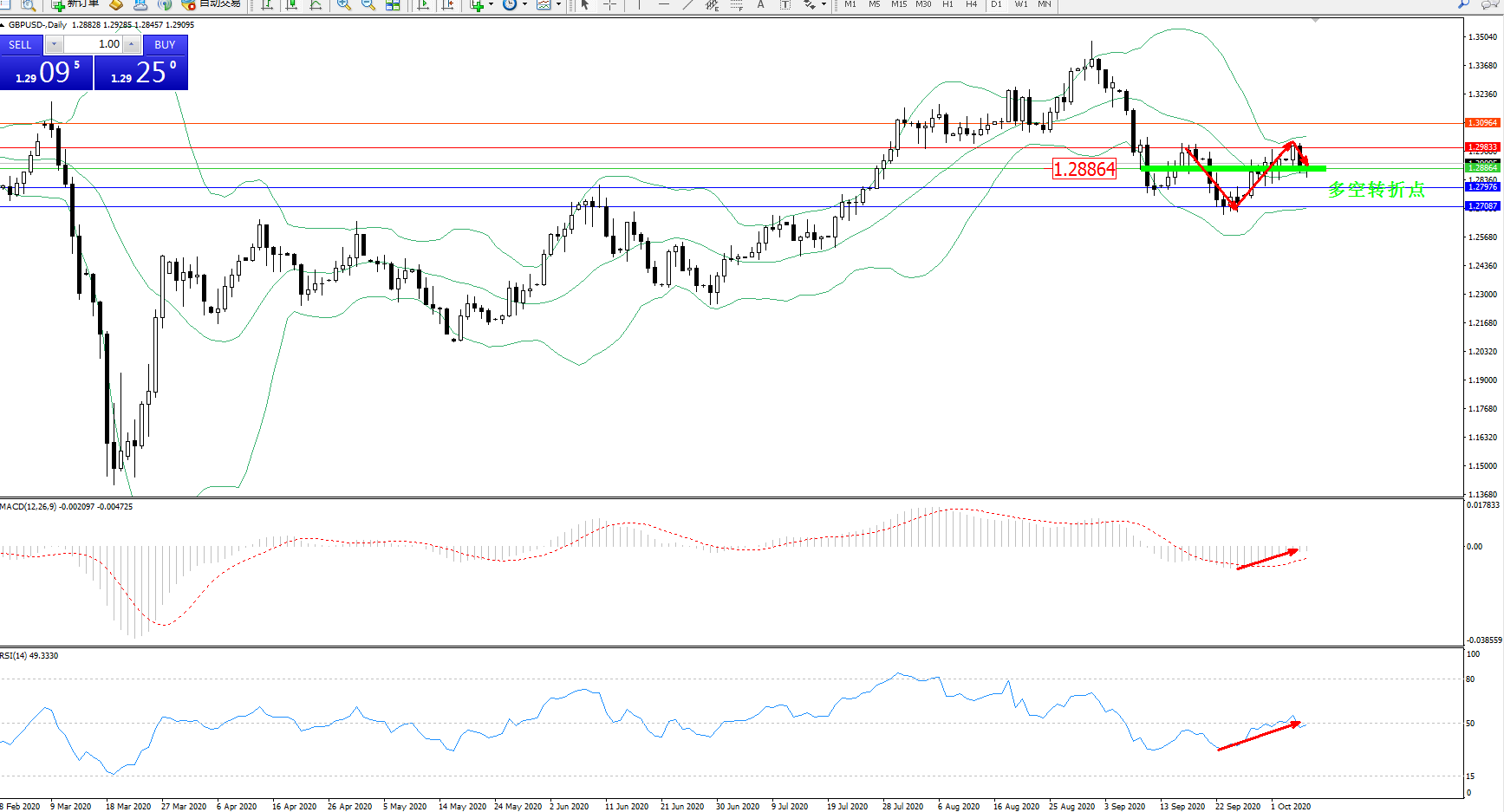 交易策略:1.28864下方看跌,目标1.30964、1.31812