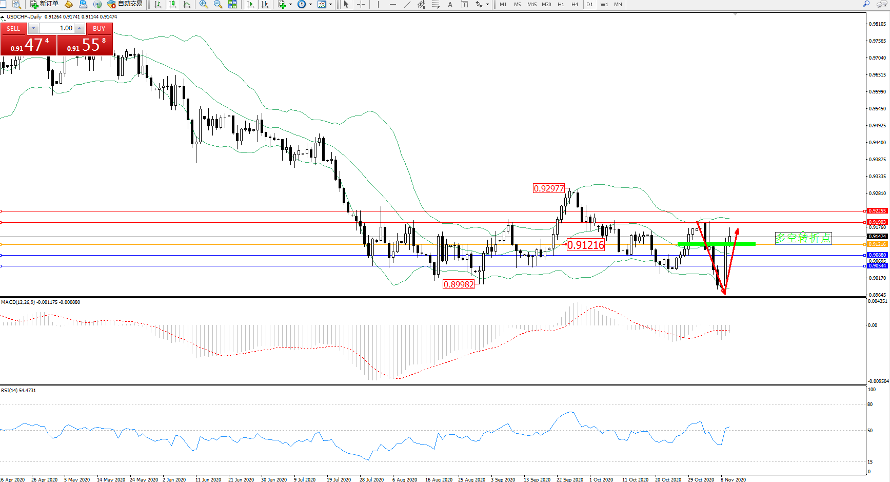 交易策略:0.91216上方看涨,目标0.91903、0.92255