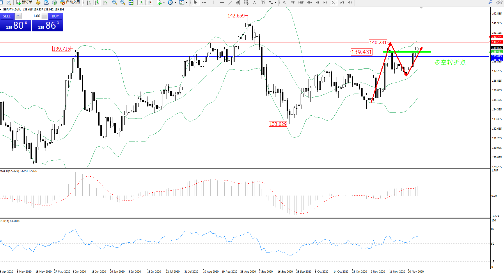 技术点评:多头动力处于布林带指标通道呃逆中上轨区间持续震荡上扬态势良好,呈阶梯向上移动持续中,布林带指标呈收口向上移动走势持续中,前期高位140.281位置近在咫尺破位在即,MACD指标处于0轴线上方多头区域维持平缓移动后有继续上移迹象,RSI指标处于50均衡线上方多头区域维持整理平移中;