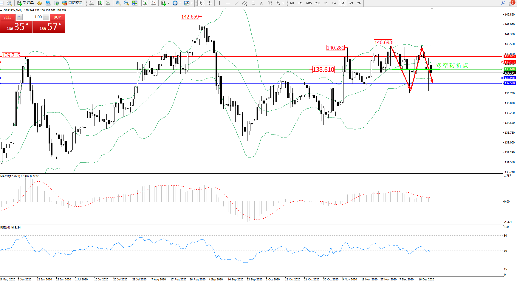 交易策略:138.610下方看跌,目标137.948、137.528