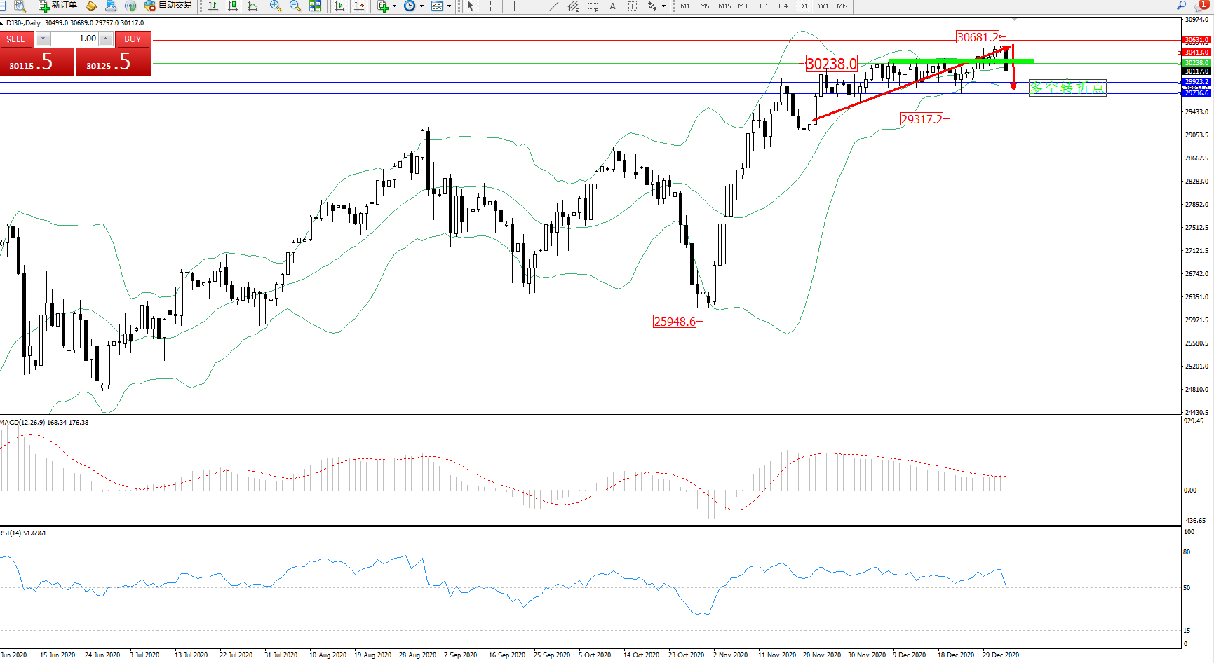 技术点评:多头动力延续布林带指标通道内高位维持窄幅整理后出现急速下挫,布林带指标呈缓慢张口走势后有收口迹象,高位抵达30681位置后短期遇阻,长时间处于高位震荡中,MACD指标处于多头区域持续整理平移,RSI指标处于50均衡线上方震荡后急速回撤下行;