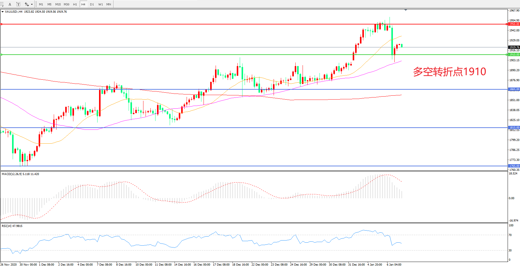 4小时图看,金价长阴下破,短期涨势受到影响,但1910支撑仍然稳固,上行形态依然完好,均线系统拐头向上, MACD红柱减少,RSI指标走平,日内延续上行概率较大。