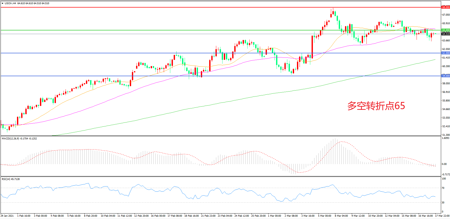 周三(3月17日),根据美国能源信息署公布的数据显示,当周EIA原油库存增加239.6万桶,基本符合预期,但精炼油库存和汽油库存较预期大幅增加,拖累了油市的短期表现,油价快速回落,随后美联储宣布维持宽松政策不变,风险资产受到提振,美元指数转跌且跌幅扩大,美国WTI原油小幅回升后收报64.55美元/桶。