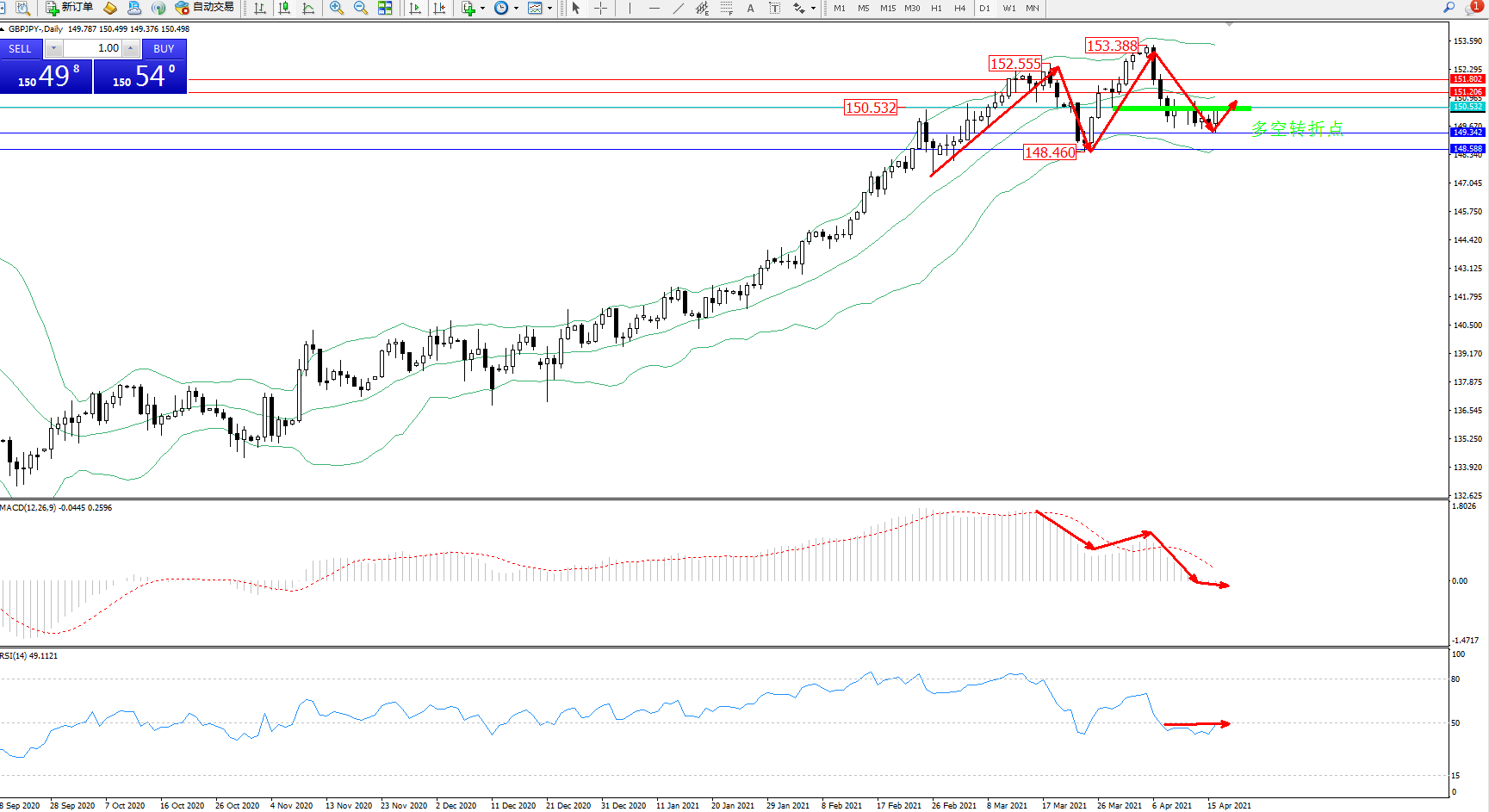 交易策略:150.532下方看跌,目标149.342、148.588
