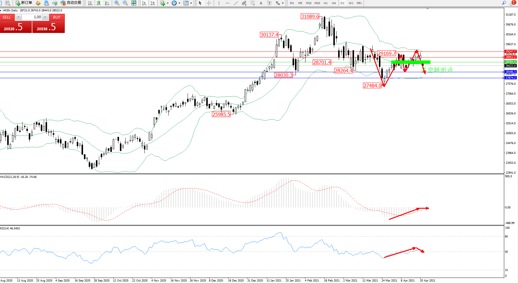 香港恒生指数4月21日(周三)收盘下跌513.81点,跌幅1.76%,报28621.92点;港股三大指数全线大跌,行业板块多数下挫。恒生科技指数跌1.52%报8185点。三桶油全天表现弱势;大型科技股亦集体走低,京东、美团均跌近4%,腾讯、阿里巴巴跌超2%;港股市场此前持续回调的医疗器械股今日集体走强,其中,爱康医疗和春立医疗盘中均涨超10%,永胜医疗、现代牙科、康基医疗、先健科技和心通医疗均涨明显上涨。大市成交额小幅缩量至1543亿港元,南下资金逆势净流入47.73亿港元。近日印度、日本和韩国的疫情加剧,二级市场上以疫苗和医疗器械为主的抗疫概念股目前有所表现。另外,欧盟委员会昨日在一份公告中称,鉴于欧盟成员国抗击新冠肺炎疫情仍面临挑战,从第三国进口医疗设备和个人防护装备仍十分重要,欧盟决定将免税有效期从今年的4月30日延至12月31日,从而继续为成员国提供财政支持,帮助医护人员和患者获取口罩、呼吸机等急需的抗疫物资。南下资金今日净买入港股42.1亿港元,连续四日增持港股。安踏体育、美团-W、小米集团-W净买入额位列前三,分别获净买入31.74亿港元、7.04亿港元、3.28亿港元。净卖出前三个股为腾讯控股、中芯国际、建设银行,分别遭净卖出8.06亿港元、1.9亿港元、0.89亿港元。