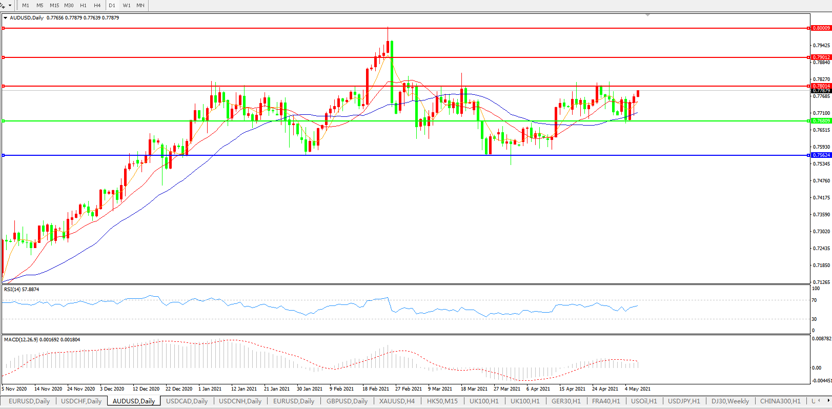 备选策略:0.7680下方看跌,目标0.7560、0.7400