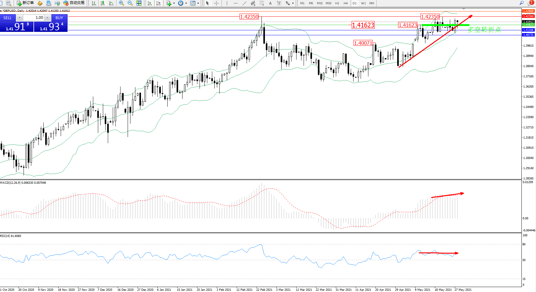 交易策略:1.41623上方看涨,目标1.42350、1.42808