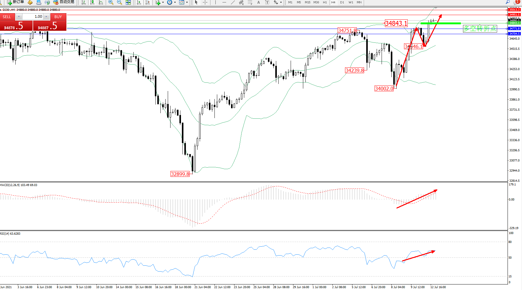 道琼斯指数DJ30——4小时K线图显示: