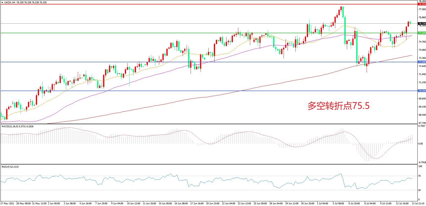 交易策略:在75.50之上看涨,目标78.00    80.00