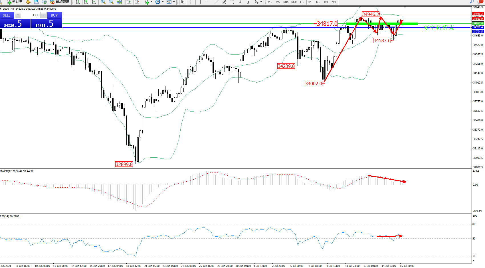 道琼斯指数DJ30——4小时K线图显示: