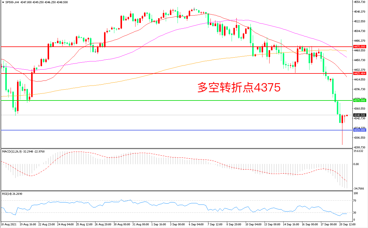 周一(9月20日),由于投资者担忧美联储减码前景,全球市场一片恐慌。美股三大指数全线重挫,标普500指数暴跌1.7%,收报4347点。美联储将于今日开始为期两天的议息会议,如果美联储高层表达出“通胀激增、就业市场有所进展”并给出准备收紧流动性的信号,将会引发美股的进一步大跌。