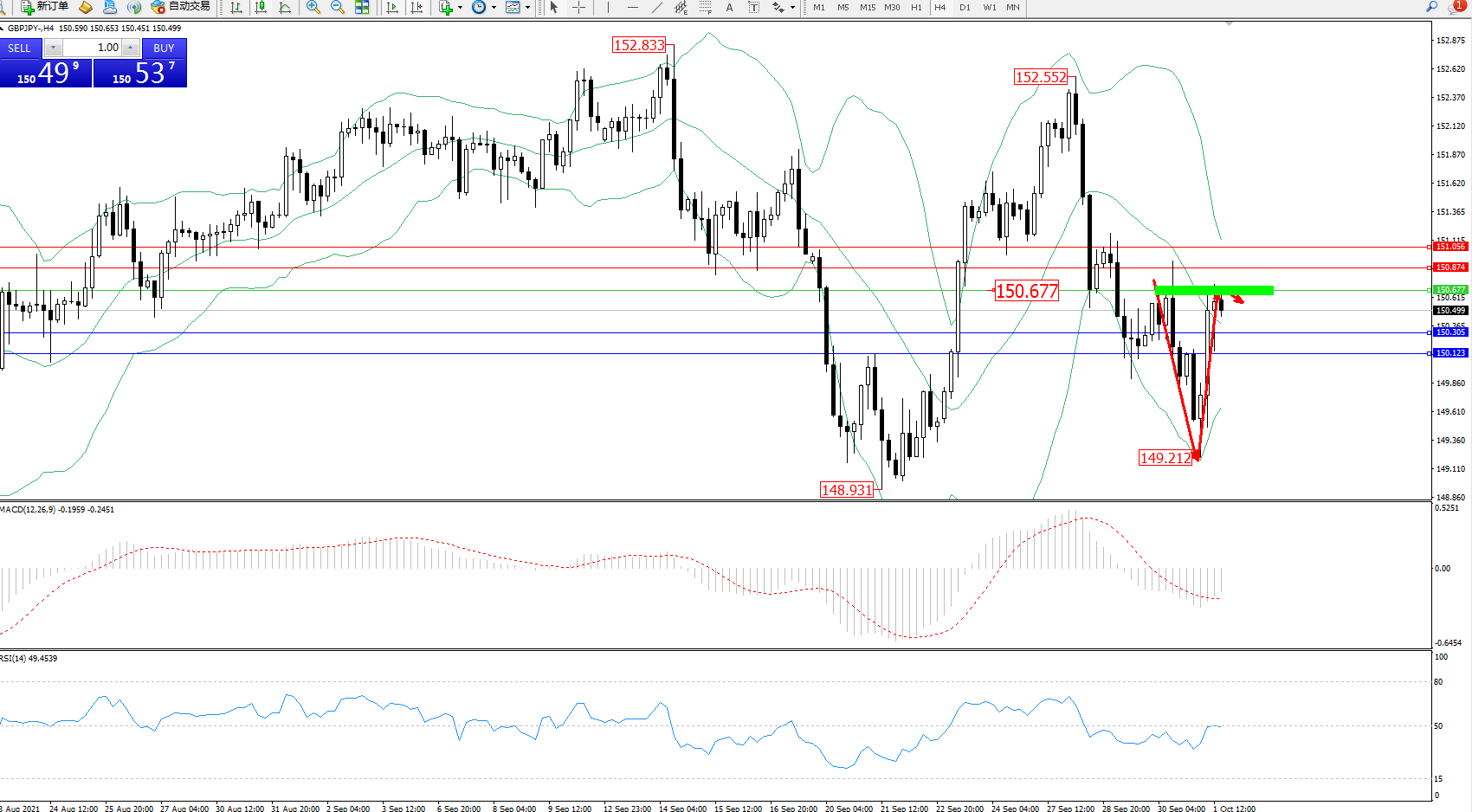 交易策略:150.677下方看跌,目标150.305、150.123