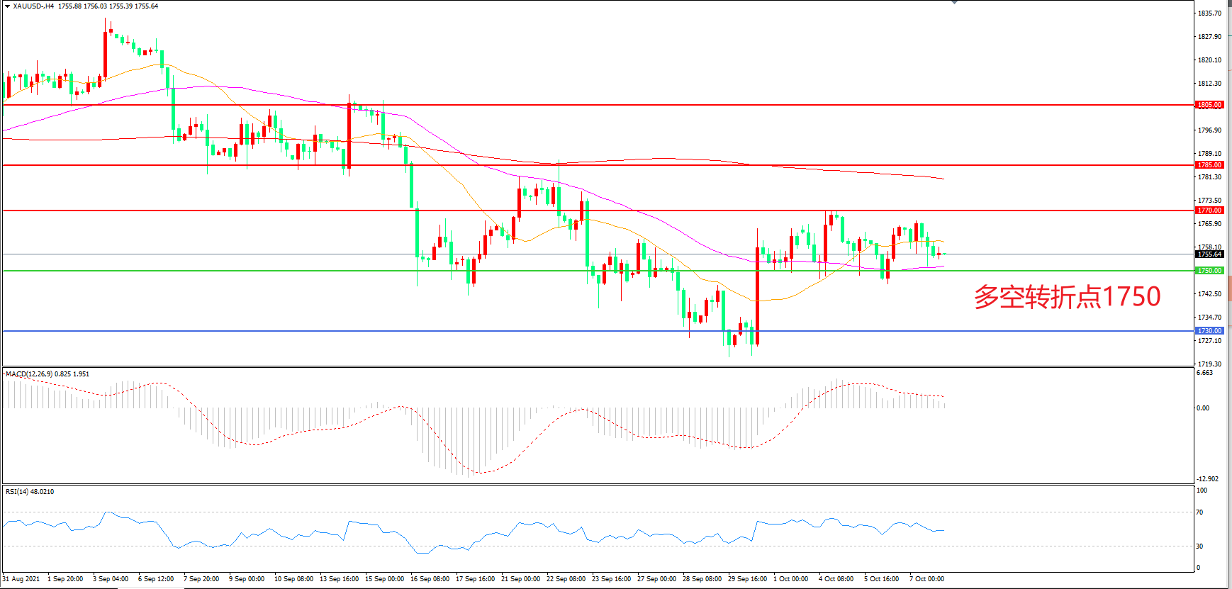 周四(10月7日),美国参议院多数党领袖舒默宣布,已就提高短期债务上限达成协议,市场风险情绪改善,金价承压小幅下行,收报1755.56美元/盎司。眼下市场都在等待晚间非农就业数据的公布,强劲的非农可能导致美联储在今年晚些时候缩减购债规模并在2022年加息,从而支持美元,重点关注1750一线的得失。