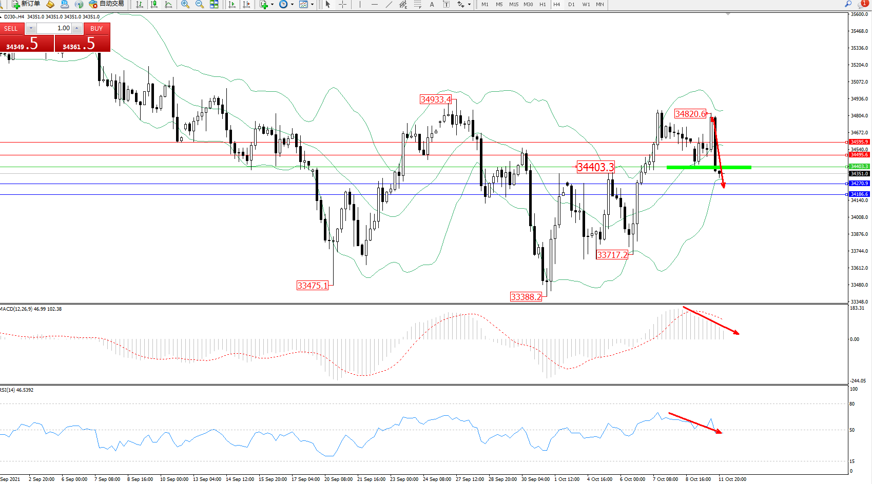 交易策略:34403下方看跌,目标34270、34186