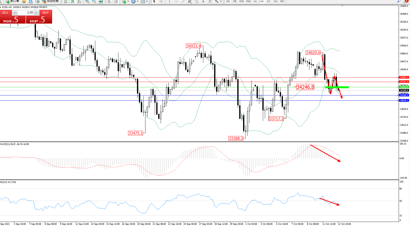 道琼斯指数DJ30——4小时K线图显示: