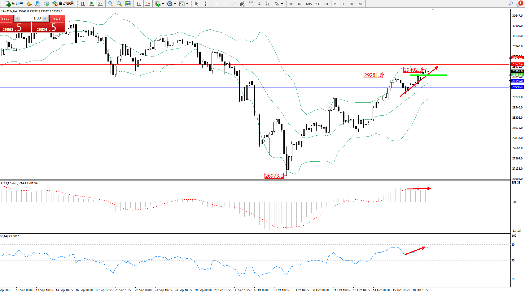 日经指数JPN225——4小时K线图显示: