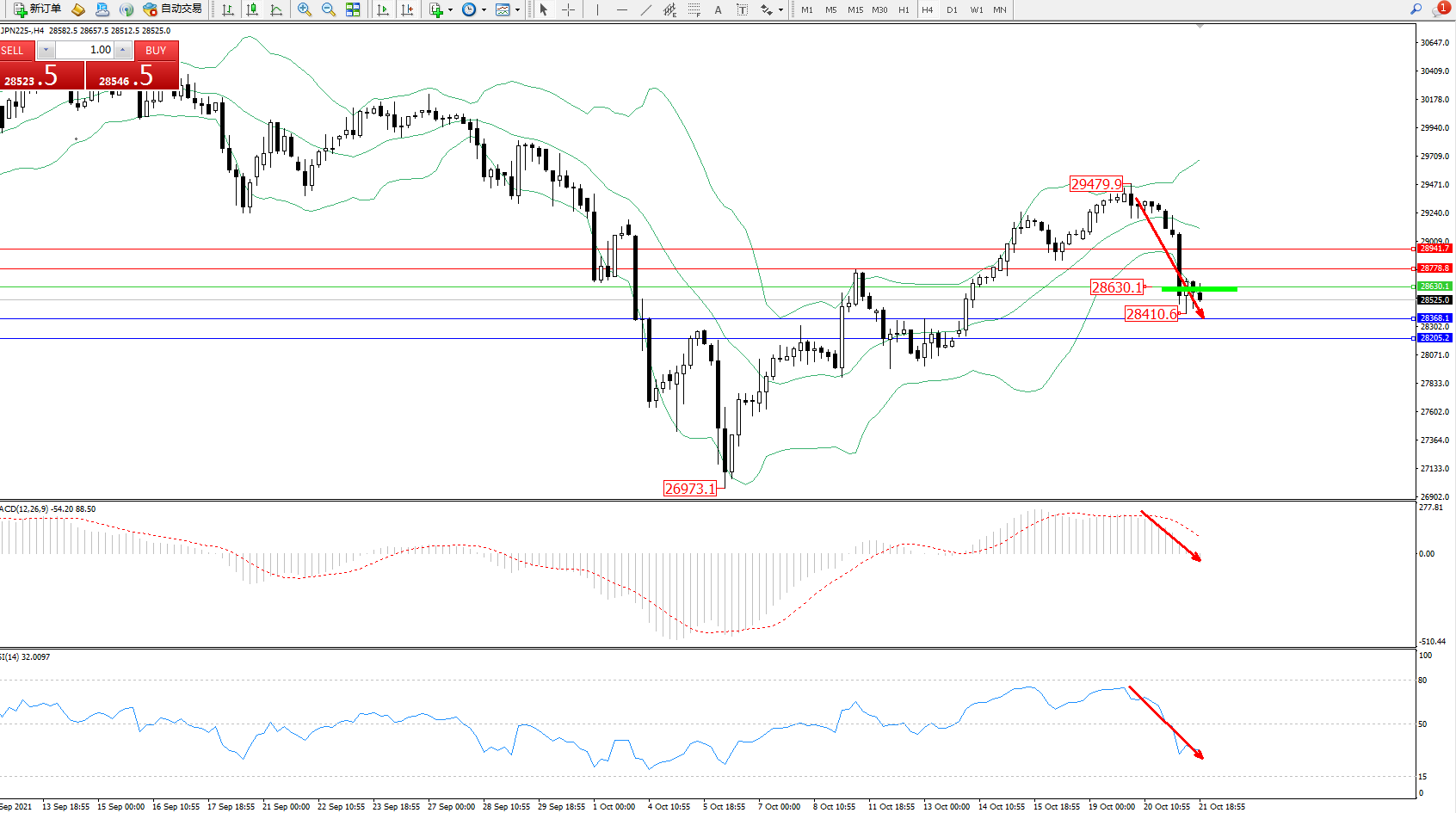 日经指数JPN225——4小时K线图显示: