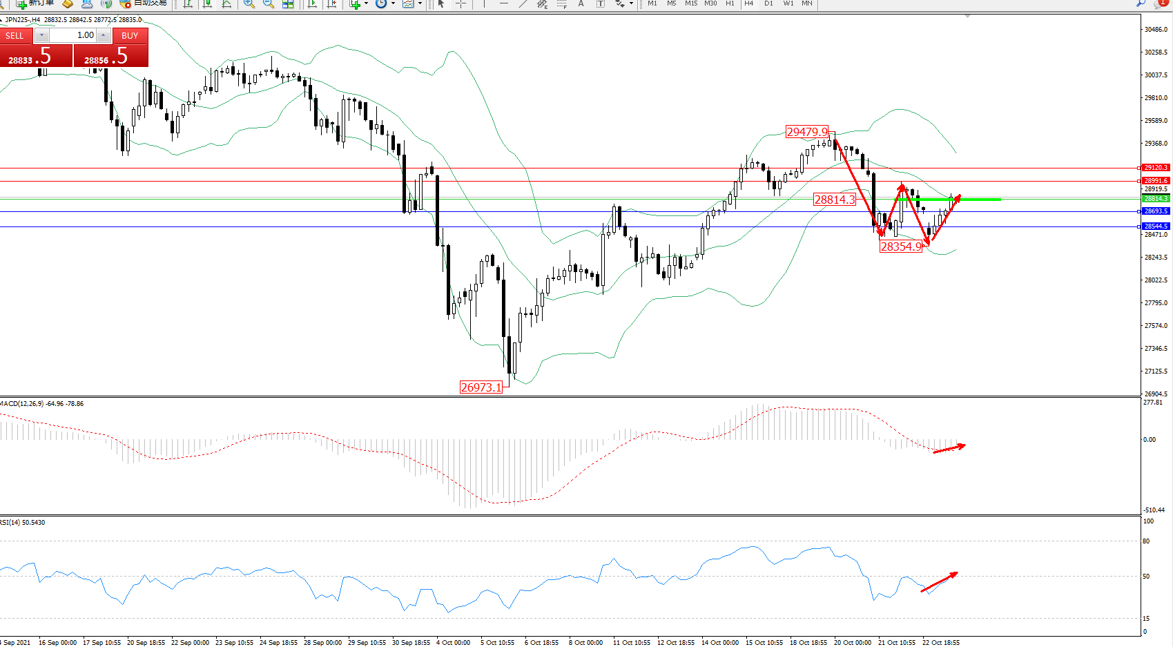 日经指数JPN225——4小时K线图显示:
