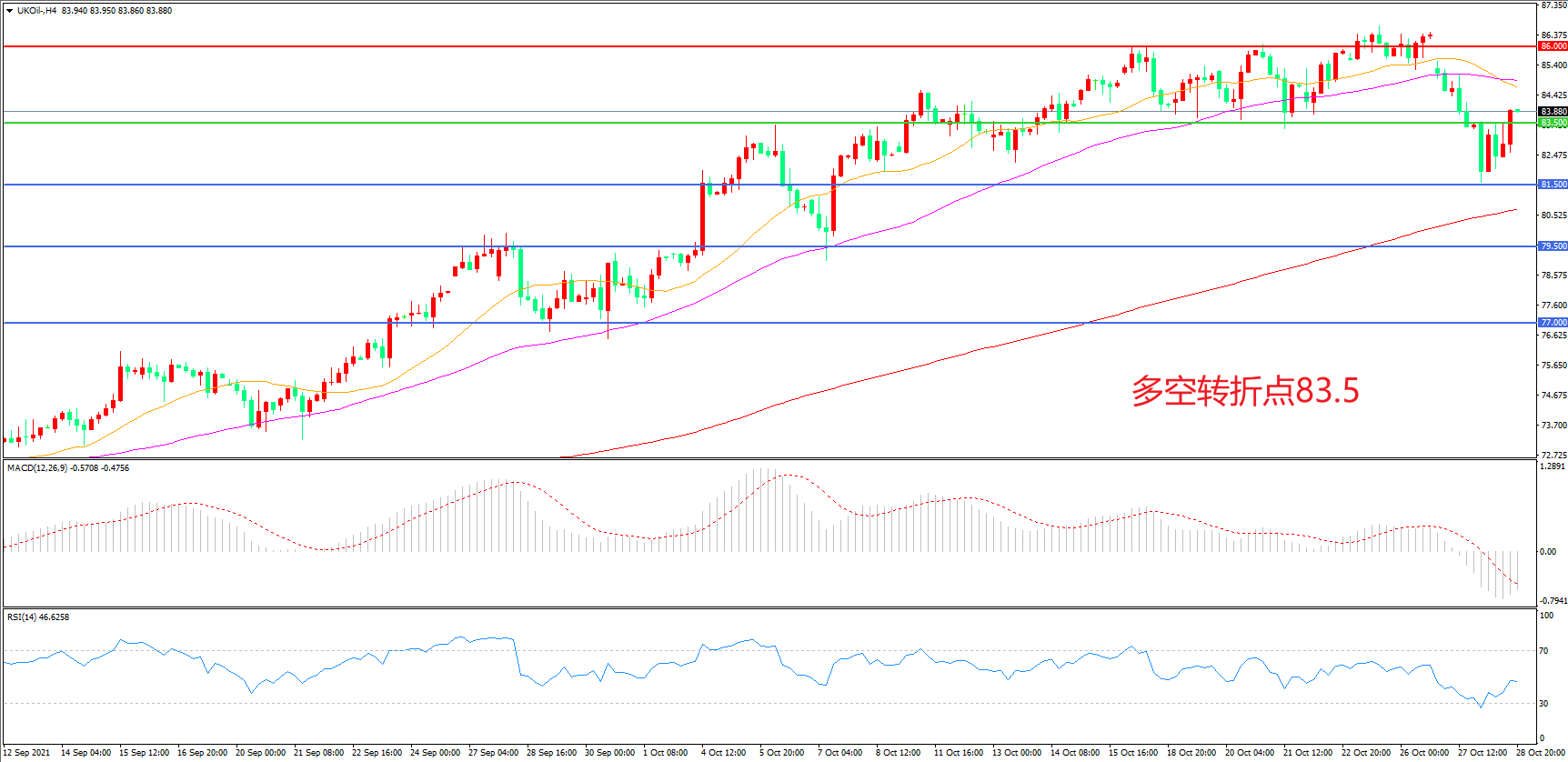 4小时图看,油价低位调整后再度拉升,整体表现偏强,84.5成为上方阻力,82成为下方支撑,MACD绿柱缩短,RSI指标走平,日内延续震荡概率较大。