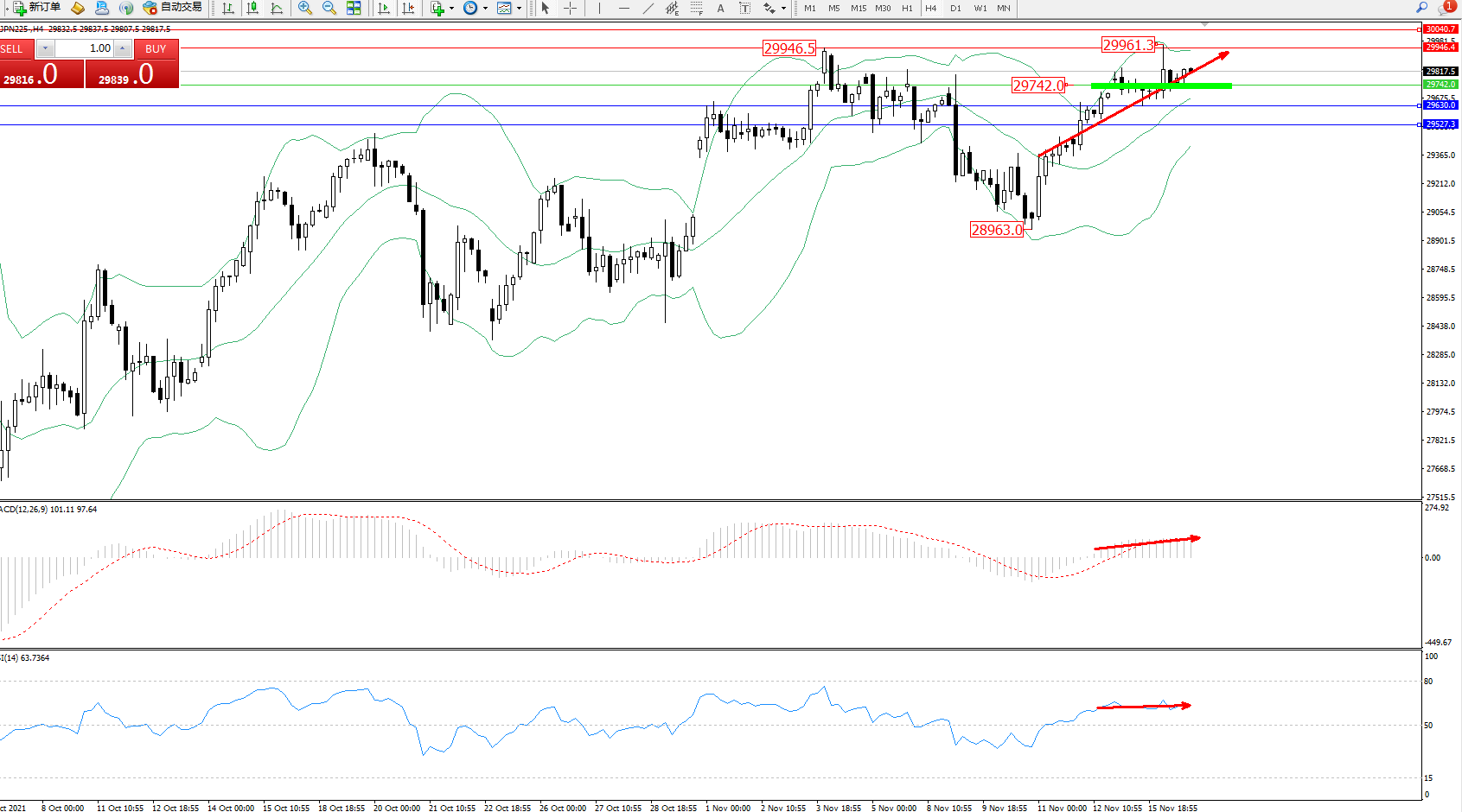 日经指数JPN225——4小时K线图显示: