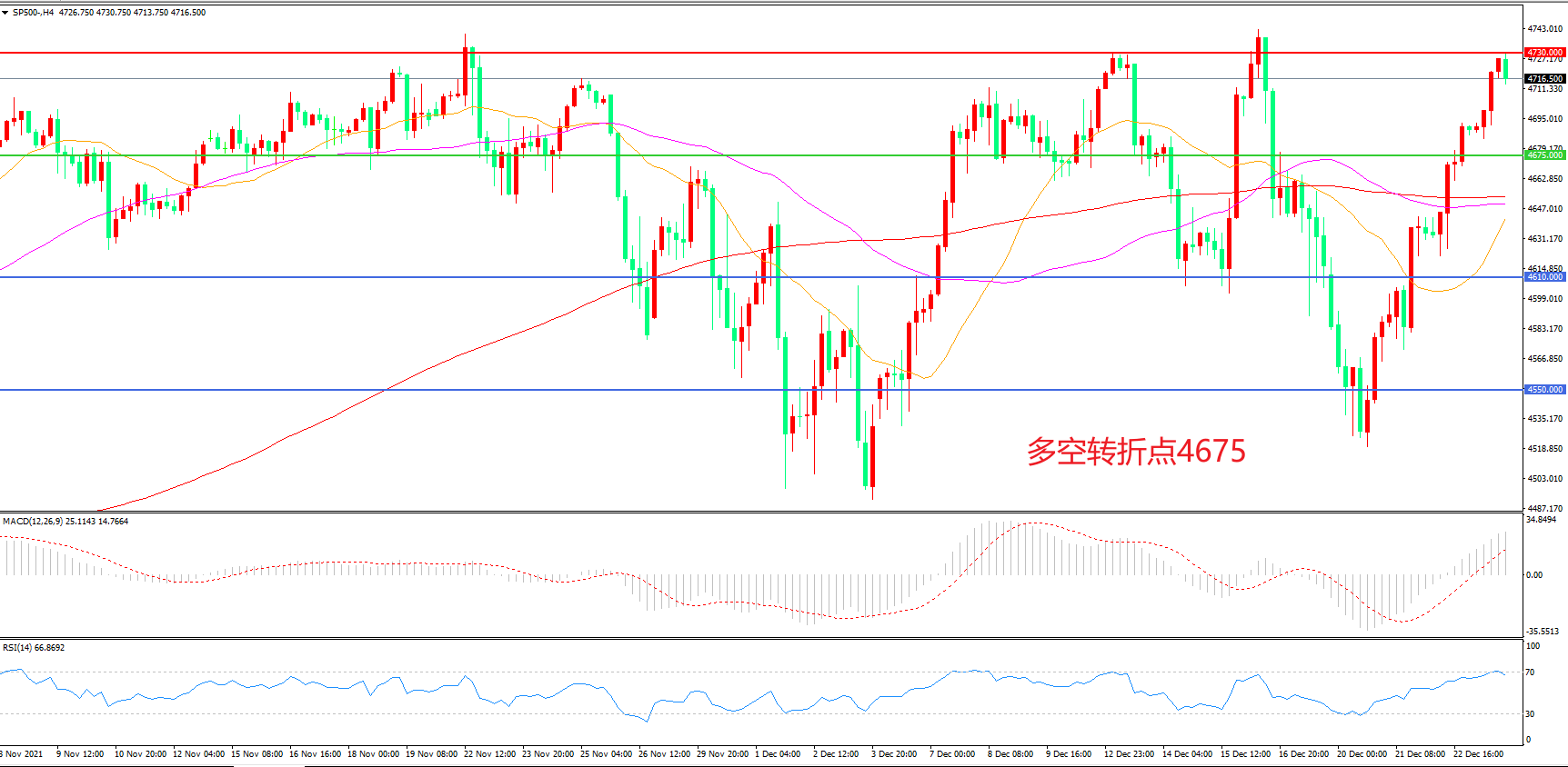 4小时图看,标普500长阳拉升,短线走势有所回暖,均线系统粘合形成下方支撑,4675成为多空分水岭,MACD红烛增加,日内震荡上行概率较大。