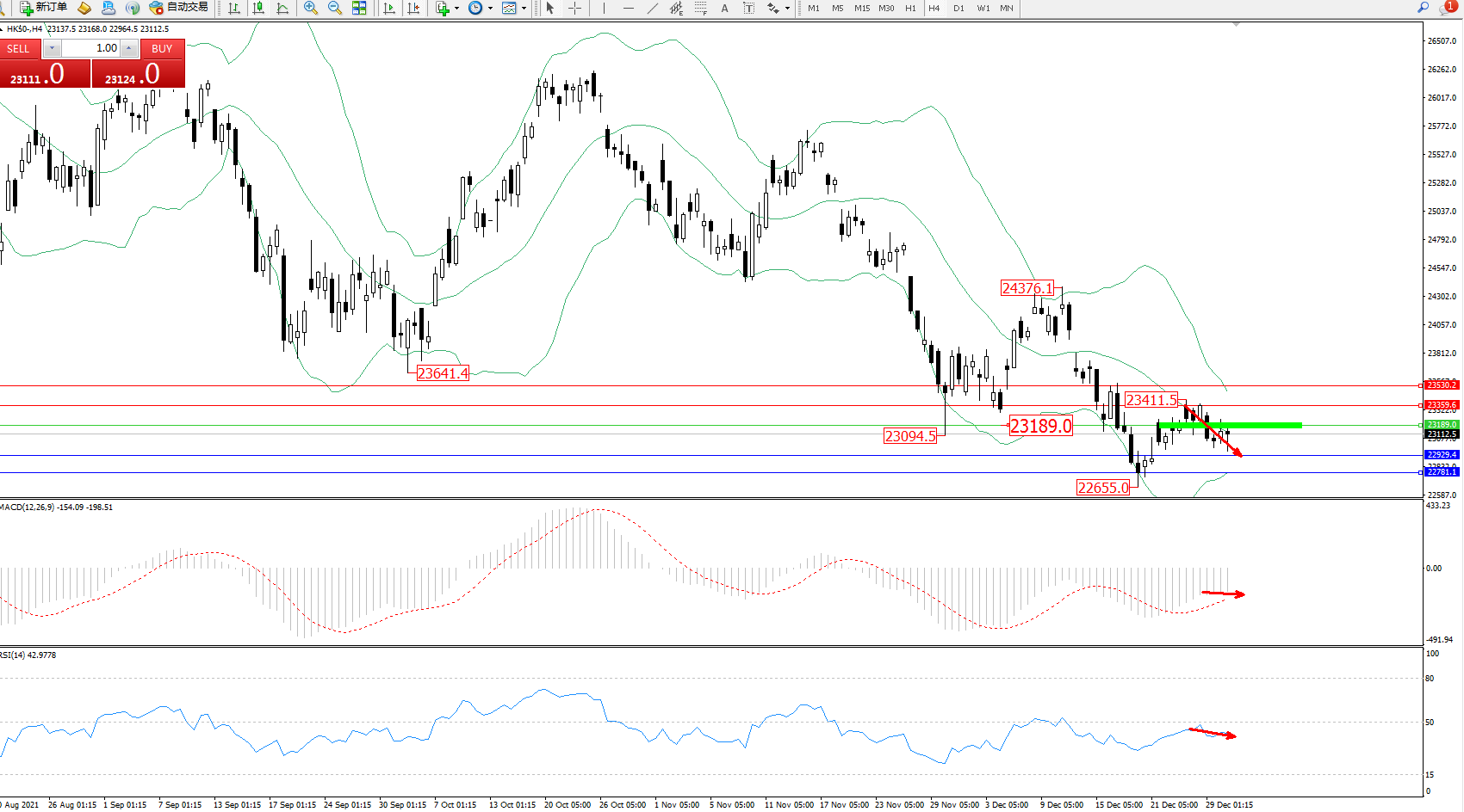 恒指HK50 ——4小时K线图显示: