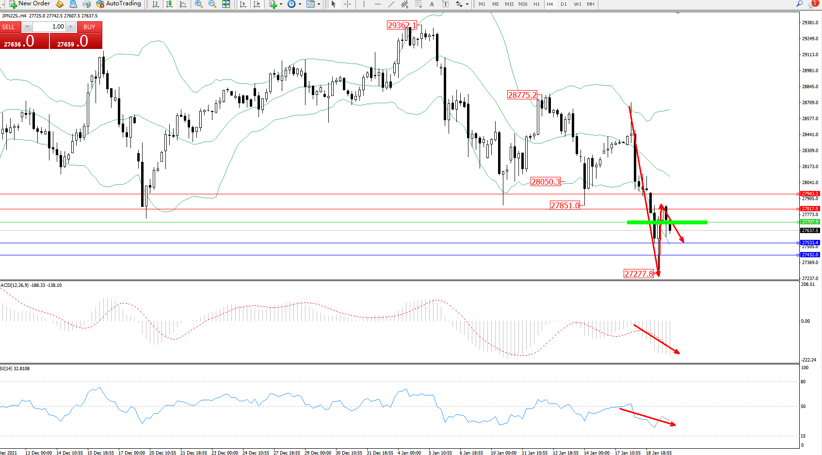 日经指数JPN225——4小时K线图显示: