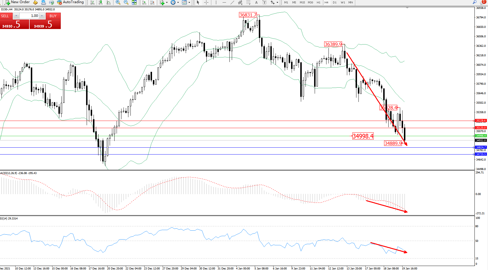 道琼斯指数DJ30——4小时K线图显示: