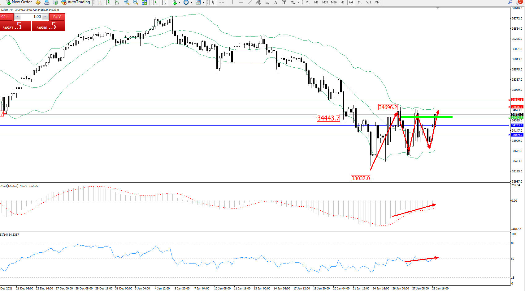 道琼斯指数DJ30——4小时K线图显示: