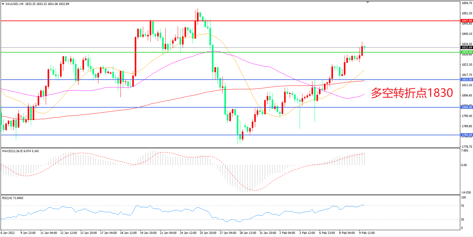 周三(2月9日),在欧洲央行行长拉加德本周稍早称不需要大幅收紧货币、高通胀会回落后,美债收益率与美指携手回落,现货黄金小幅走高,收报1832.88美元/盎司。日内基金公布美国CPI数据极为重要,它将有助于市场确认,美联储在3月份加息幅度是中规中矩的25个基点还是直接50个基点起步,务必重点关注。