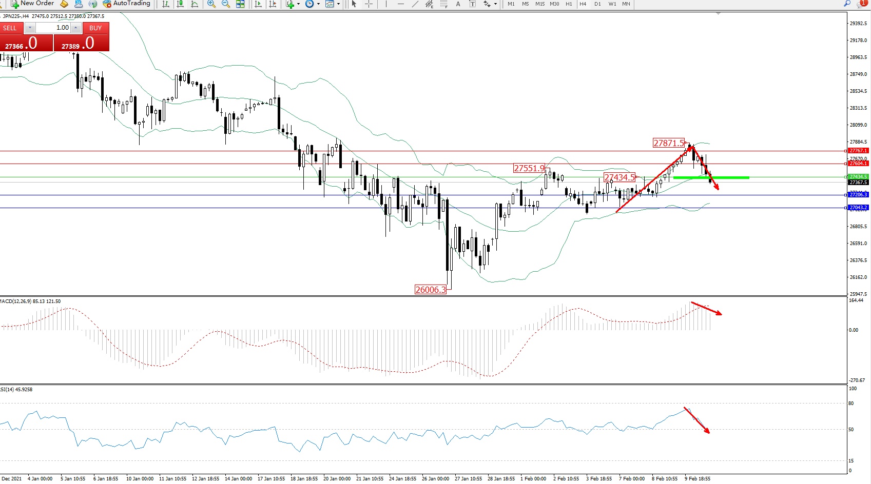 日经指数JPN225——4小时K线图显示: